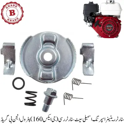 جی ایکس160 پٹرول انجن اسٹارٹر ریٹینر اسپرنگ اسمبلی سیٹ ریکوائل اسٹارٹر کی ہموار کارکردگی کو یقینی بناتا ہے۔ اعلیٰ معیار کے اسٹیل سے تیار کردہ جو دیرپا اور مضبوط ہوتا ہے۔ اسٹارٹر میکانزم کی درست فنکشننگ اور تناؤ کے لیے نہایت اہم پرزہ ہے۔ جی ایکس 160انجن مختلف ایپلیکیشنز کے ساتھ مطابقت رکھتا ہے۔